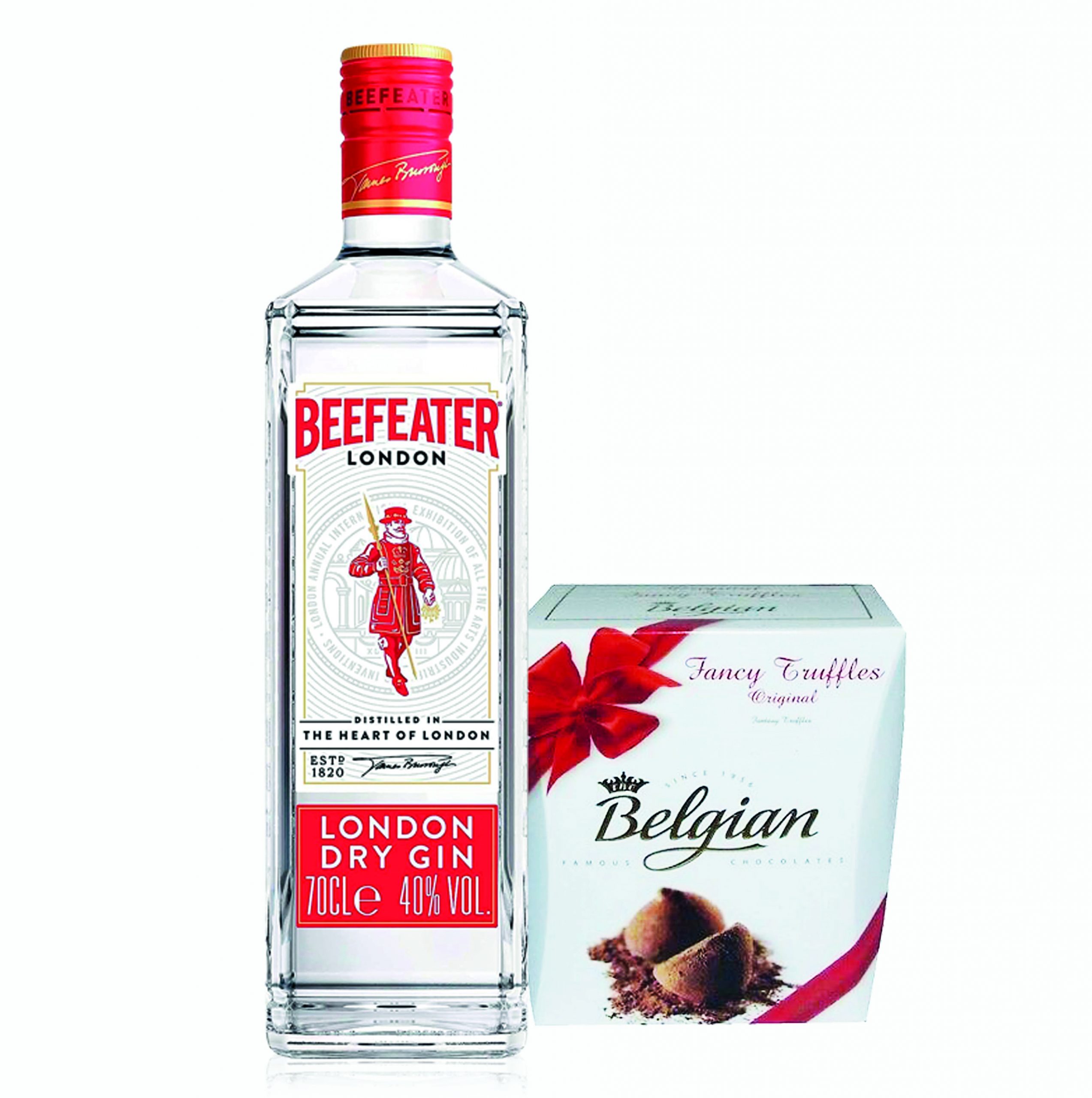 A single bottle of Beefeater London Dry England Gin 700ml together with Belgian Truffles 200g (7 oz) is presented in nice decoration. Please be aware that the flavor of chocolate could be changed according to our current stock.