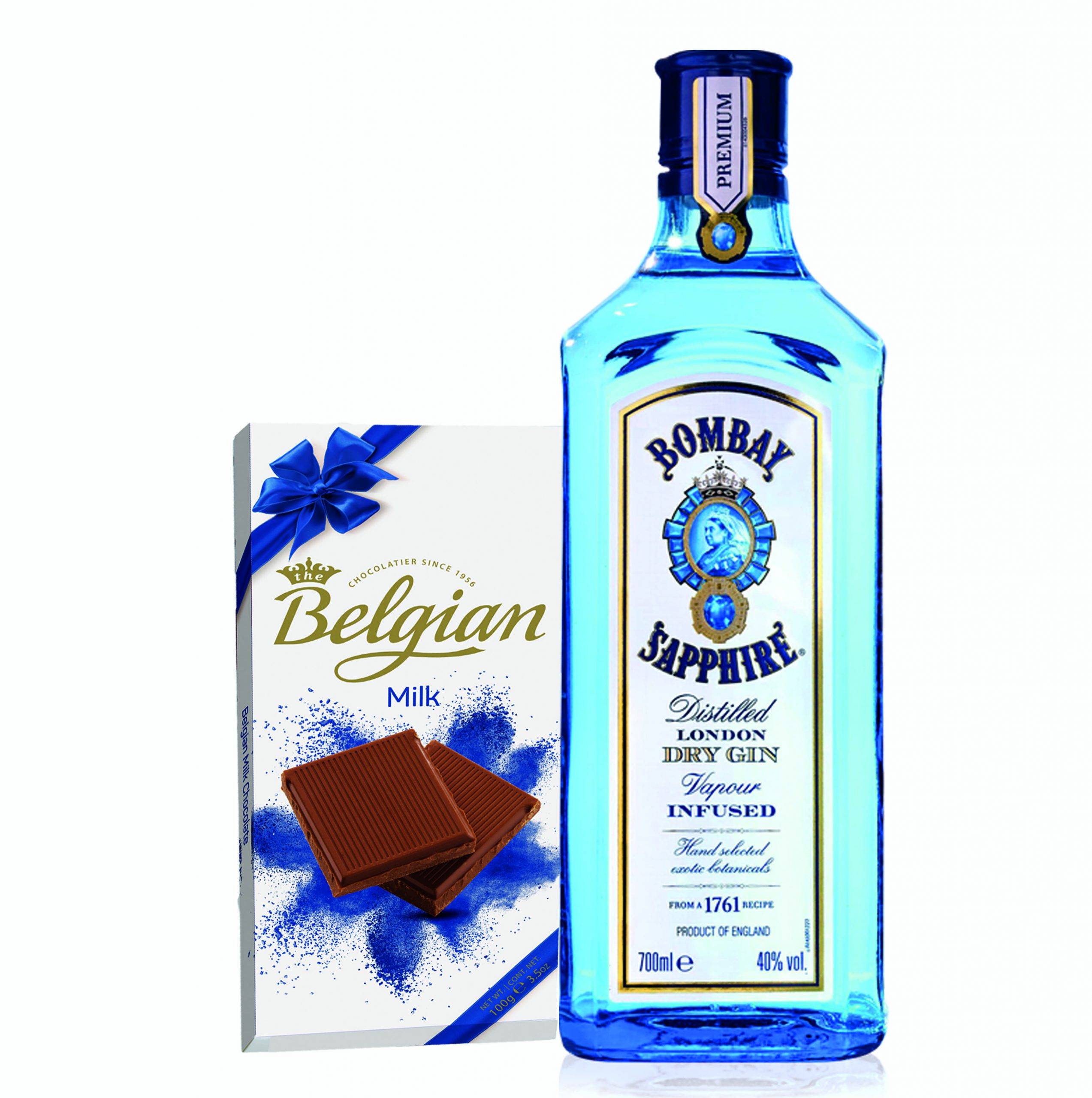A single bottle of Bombay Sapphire Gin 700ml together with Belgian Chocolate Bar 100g (3.5 oz) is presented in nice decoration. Please be aware that the flavor of chocolate could be changed according to our current stock.