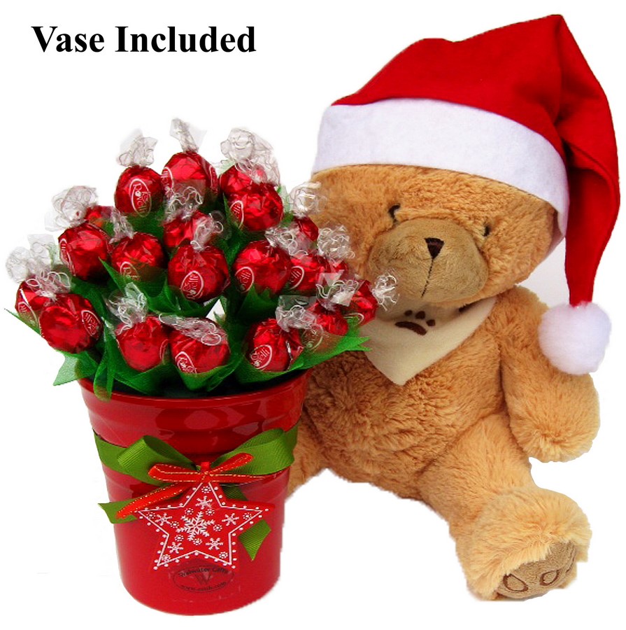 A charming Sweet Bouquet with 24 Italian Pralines, beautifully displayed in a red decorative vase together with a soft Plush 20 cm Teddy Bear!