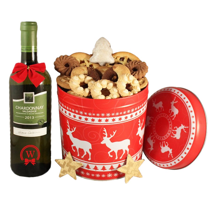 Surprise your friends, family, coworkers, employees, or clients with a wonderful 1 kg (35.2 oz) cookie selection designed with a Christmas tin box and Italian White Wine 750ml.
