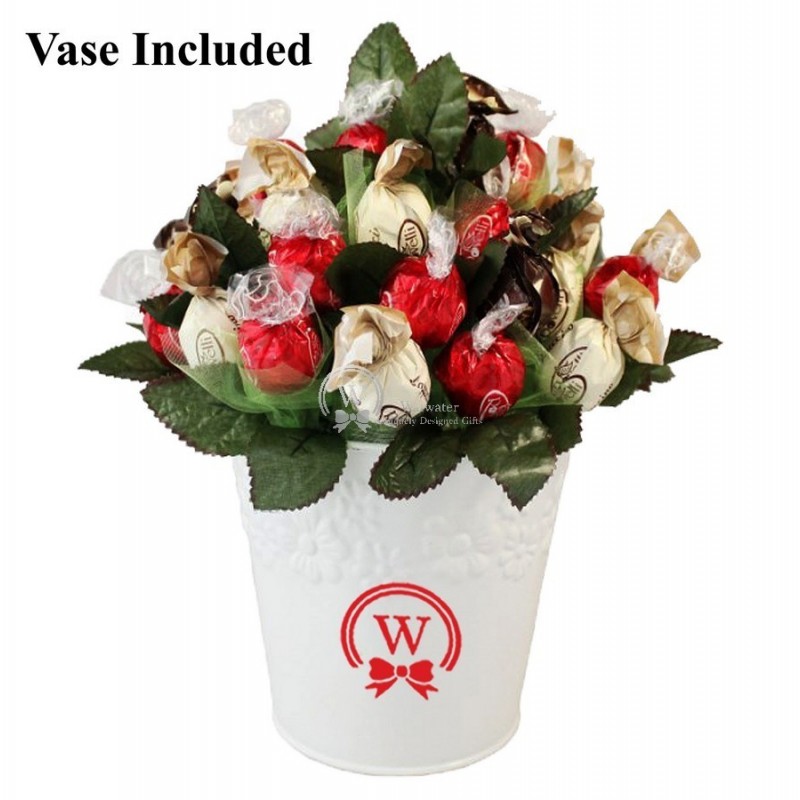 A Classic Sweet Bouquet presented in a special Decoratorive White Vase with 35 Gourmet Chocolate Pralines. The perfect way to say ‘Thank You!’ or a great gift for Birthdays, Anniversaries, and Holidays!