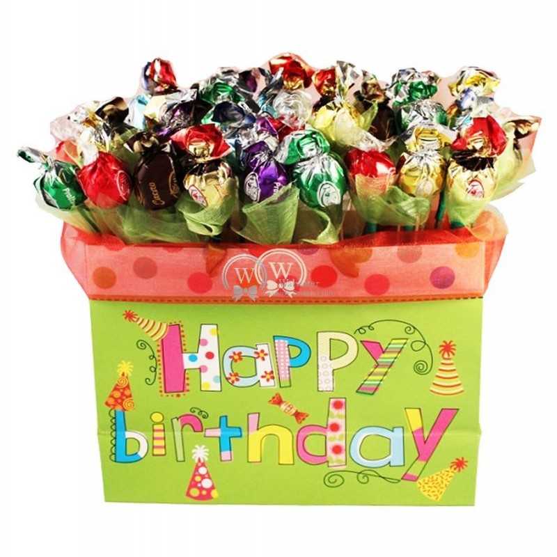 The large Happy Birthday sweet bouquet with 45x chocolate verity in the colorful bag will bring a smile to anyone’s face!