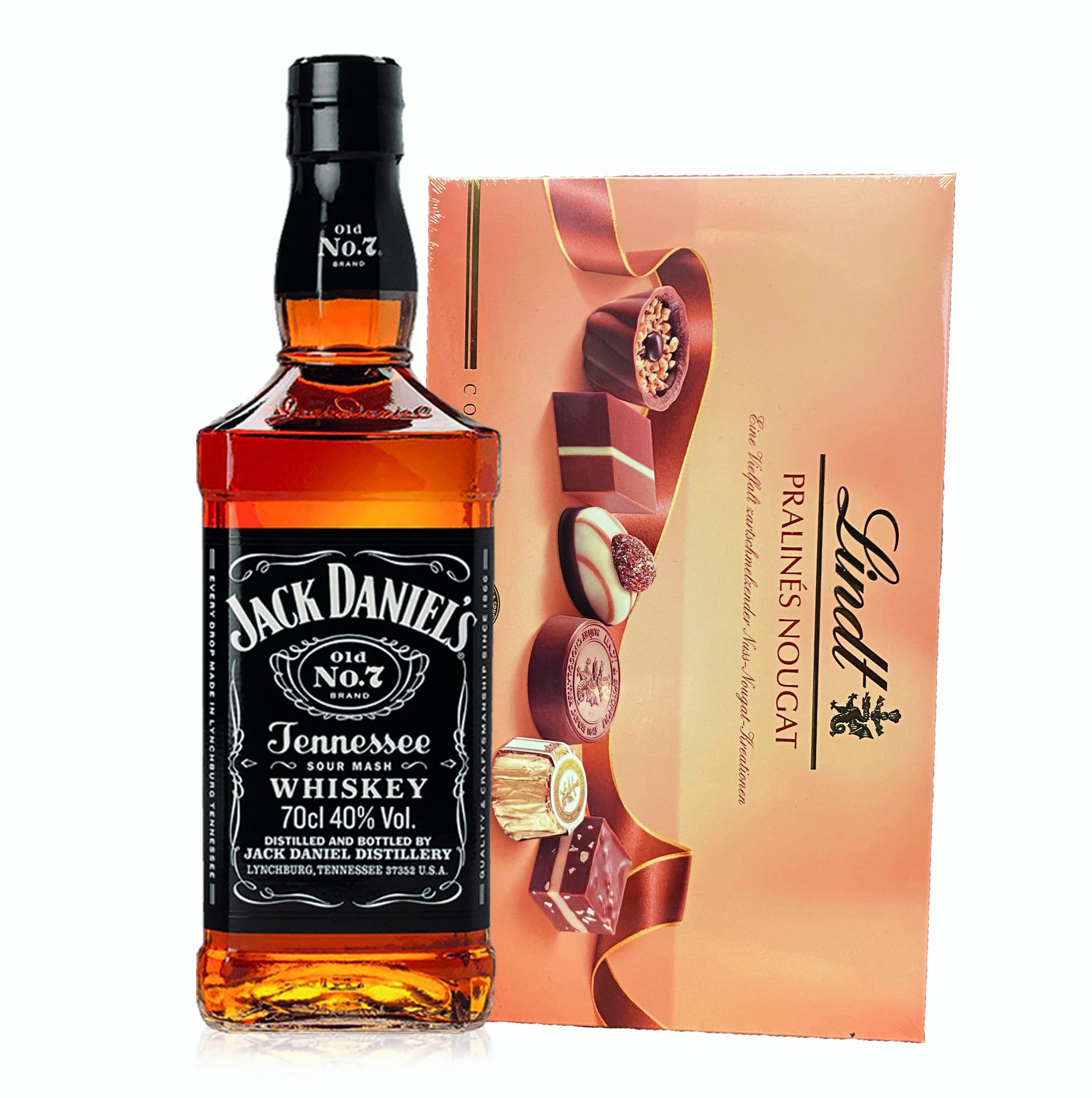 A single bottle of Jack Daniel’s Old No. 7 Black Label Tennessee Whiskey 700ml together with Lindt Pralines 150g / 5.2 Oz is presented in nice decoration. Please be aware that the flavor of chocolate could be changed according to our current stock.