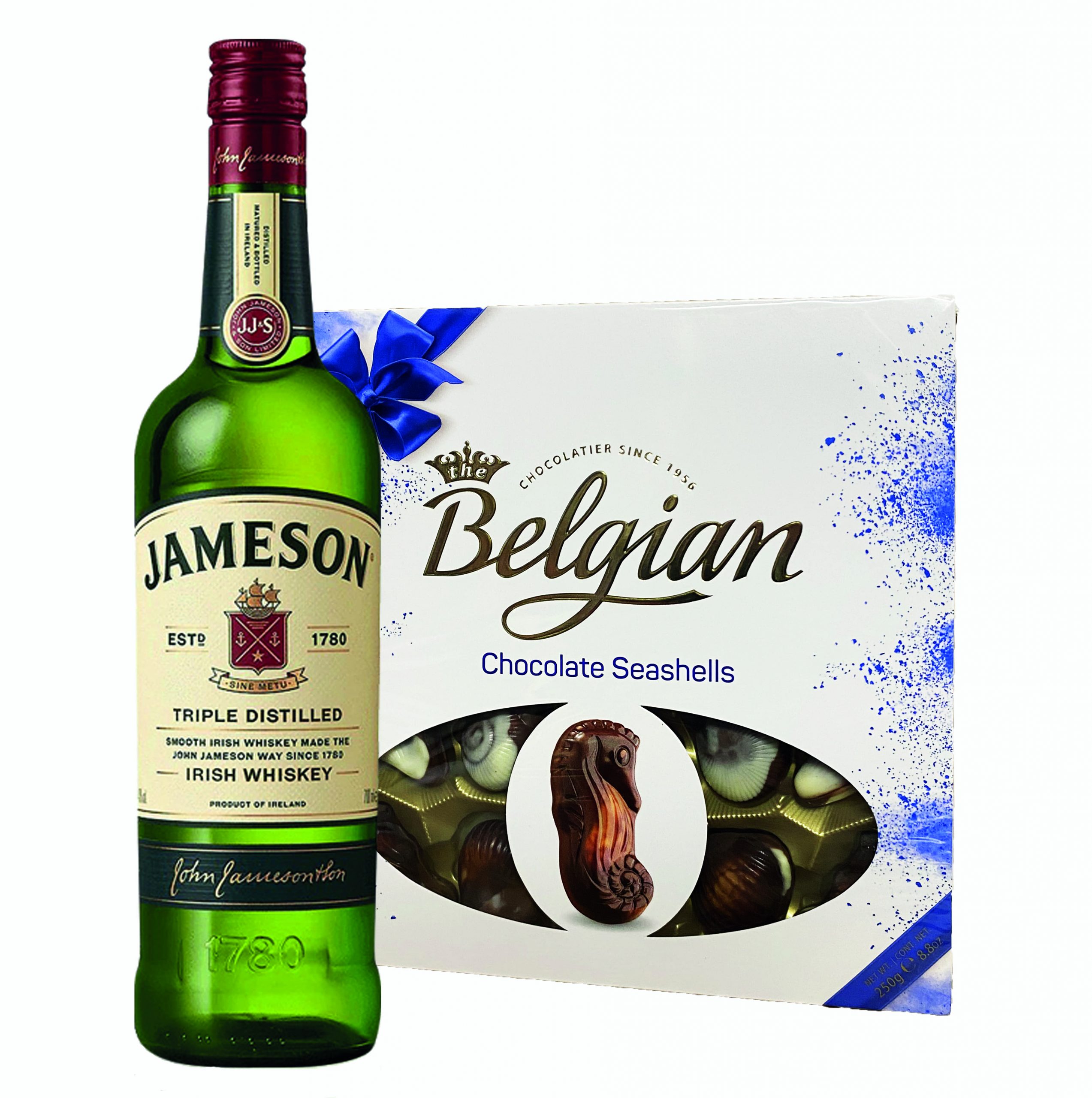 A single bottle of Jameson Blended Irish Whiskey 700ml together with Belgian Bonbonniere 200g (7 oz) is presented in nice decoration. Please be aware that the flavor of chocolate could be changed according to our current stock.