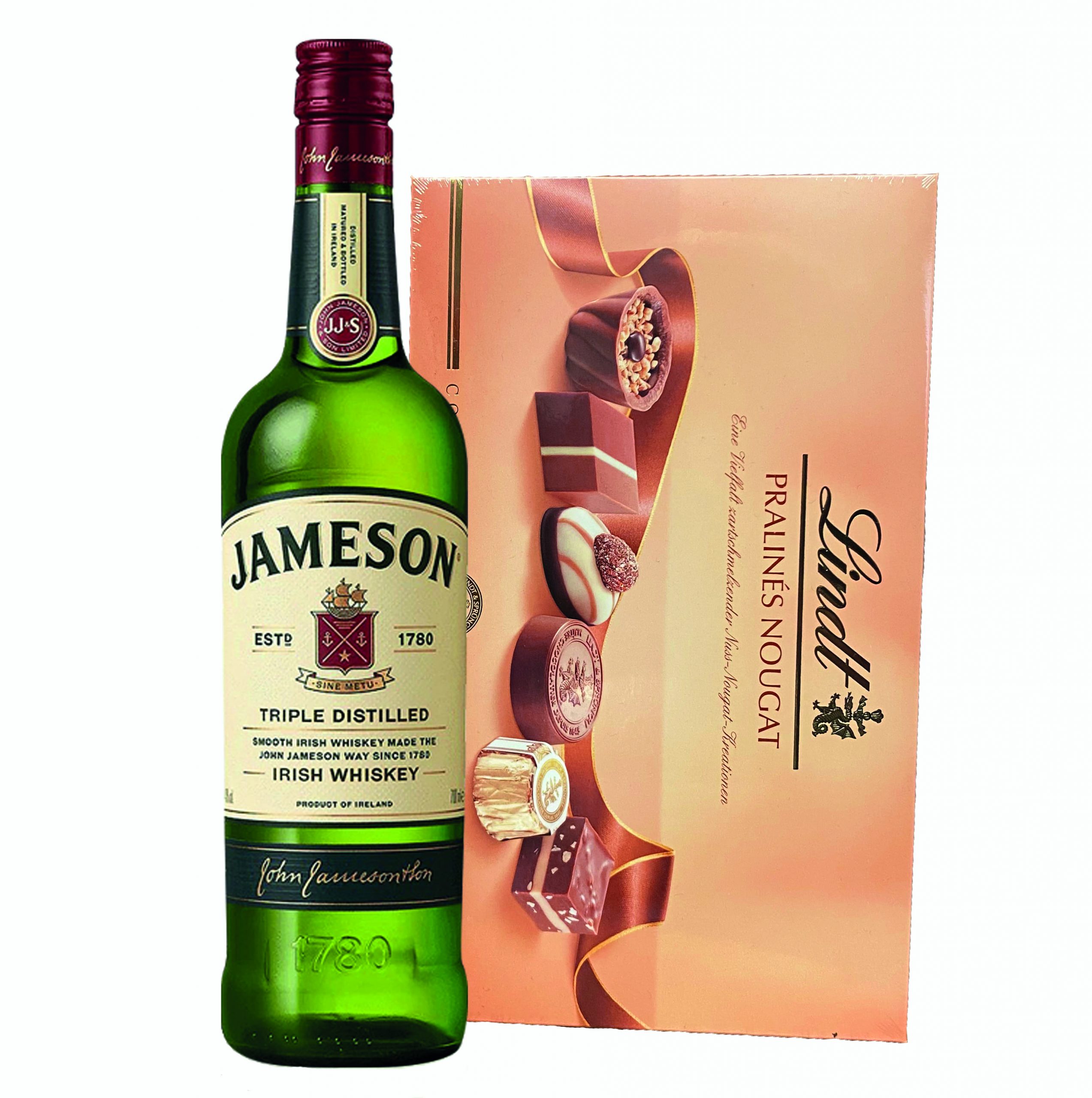 A single bottle of Jameson Blended Irish Whiskey 700ml together with Lindt Pralines 150g (5.2 oz) is presented in nice decoration. Please be aware that the flavor of chocolate could be changed according to our current stock.