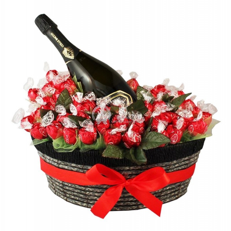 A huge amazing basket is full of 60 Red Delicious Gourmet Pralines together with a Sparkling wine 750ml.