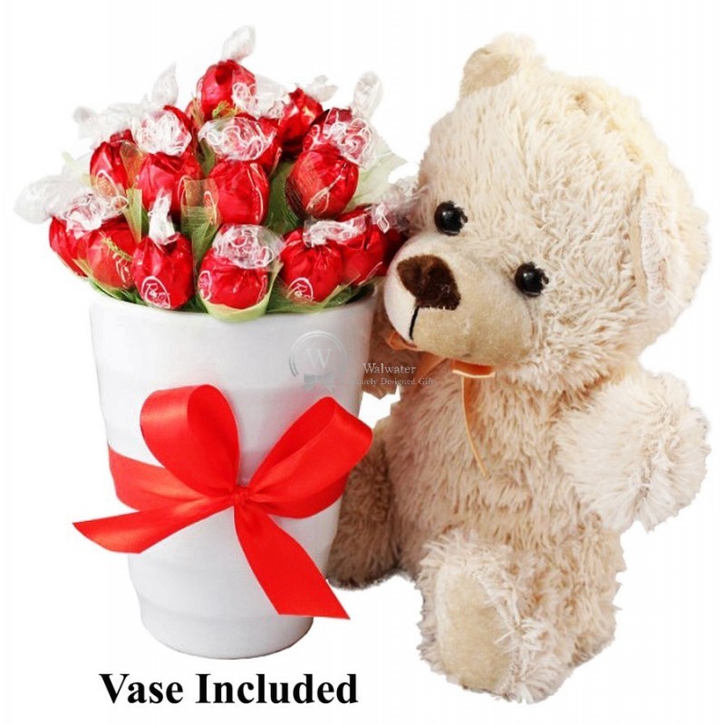 A charming Sweet Bouquet with 24 Gourmet Pralines, beautifully displayed in a Decorative vase with a soft Plush 20 cm Teddy Bear!